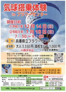 2025年11月13日 / 最終更新日時 : 2025年11月15日 flowercenter 新着情報 花と光のクリスマス 花と光のクリスマス 入口正面にある中央花壇や大温室の洋らん、球根ベゴニアをはじめ、熱帯植物や食虫植物などをロマンチックにライトアップします。 〇夜間開園日:令和7年12月6日(土)~12月21日(日)の土曜、日曜限定(雨天決行) 〇点灯時間:17時~20時 ※最終入園は19時30分 〇入園料:一般(大人) 550円 70歳以上 250円 高校生以下無料 ※各種会員等の提示による割引の適用はございません。 今年はバルーングローも予定しています!(芝生広場) 令和7年12月6日(土) 18:30~19:00の間に上がる予定です。イルミネーションとバルーンのコラボレーションをお楽しみください♪ ※この時間帯だけ芝生広場への立ち入り可能(通常の夜間開園は中央花壇、大温室のみとなります) 中央花壇中央花壇大温室 四季の花室大温室 球根ベゴニア室大温室 熱帯植物室大温室 食虫植物室中央花壇 SNS @Flower_fu FacebookXBlueskyCopy